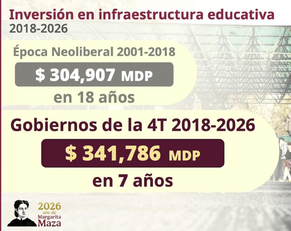 Durante la Mañanera del Pueblo de este 6 de abril, la mandataria subrayó que esta cifra representa un cambio de fondo frente a administraciones anteriores, al destacar que en siete años de gobiernos de la Cuarta Transformación ya se ha invertido más que en 18 años del periodo neoliberal. “Estamos convencidos de que la educación es un derecho y no un privilegio”, afirmó.