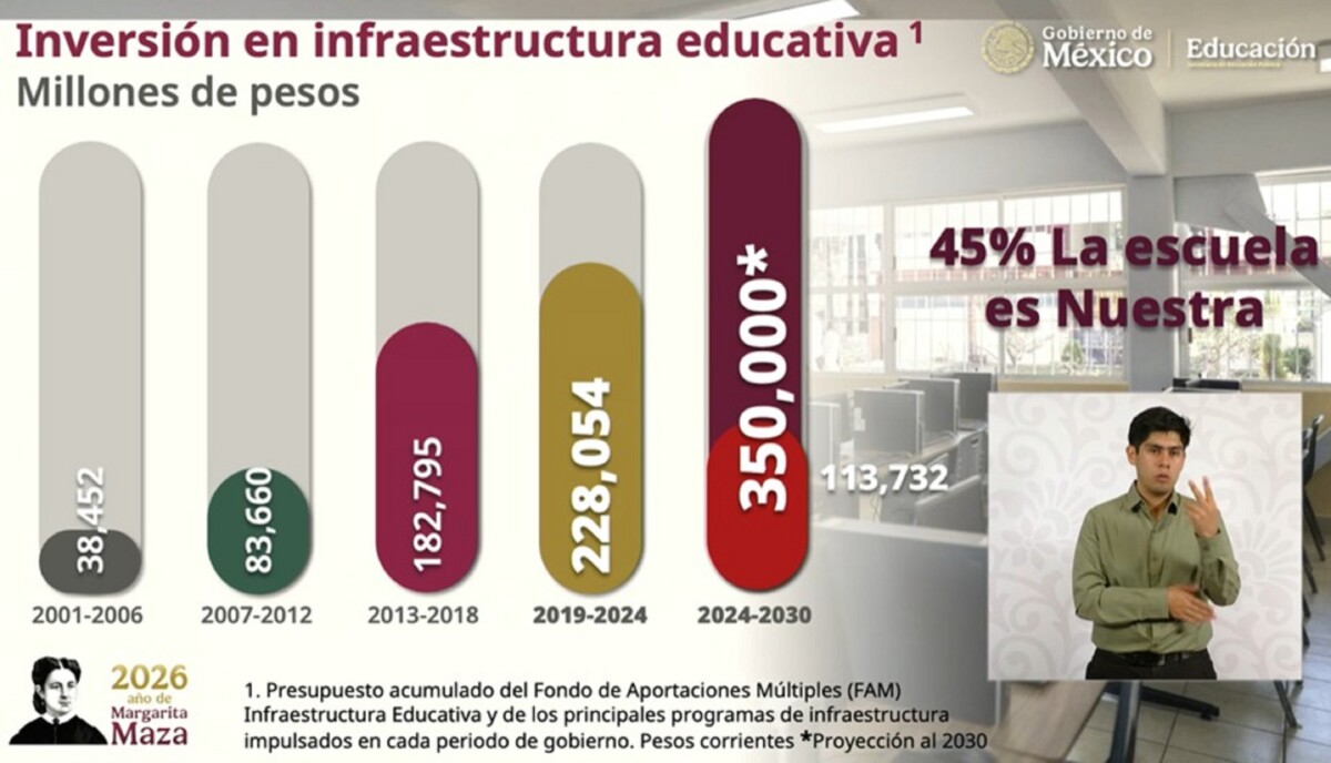 Las autoridades educativas señalaron que, en conjunto, la inversión en infraestructura durante los gobiernos recientes ya supera los 340 mil millones de pesos, lo que rebasa lo ejercido en casi dos décadas anteriores. De mantenerse este ritmo, se prevé que al cierre del sexenio se duplique la inversión histórica registrada en el país en este rubro.