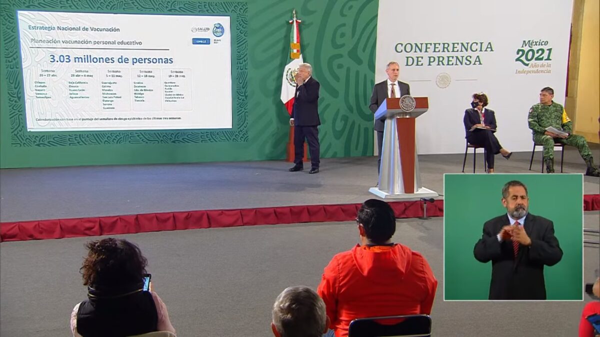 En la conferencia mañanera el doctor Hugo López-Gatell dio a conocer que a partir del 20 de abril iniciará la vacunación al personal educativo en Chiapas Veracruz, Coahuila, Nayarit y Tamaulipas.
