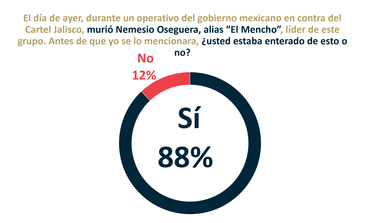 Al respecto, el estudio reveló que 8 de cada 10 mexicanos se enteraron de la operación del fin de semana, lo que refleja un alto nivel de atención pública en torno a la acción del Gobierno Federal.