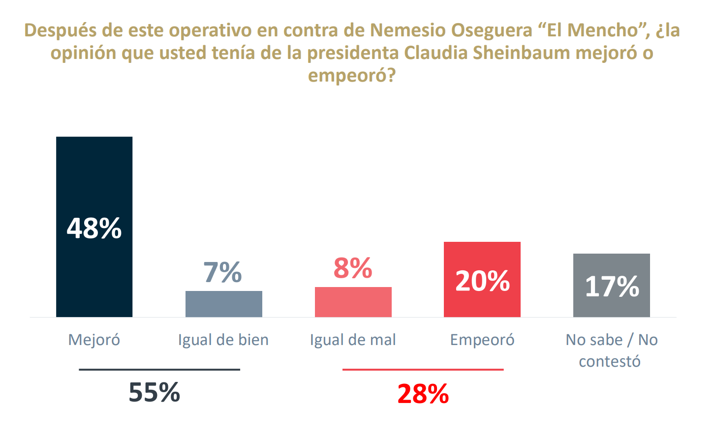 Finalmente, el sondeo destacó un positivo impacto directo en la imagen de la presidenta Claudia Sheinbaum, ya que, para el 56% de los mexicanos, la opinión que tenían de la mandataria mejoró después de la intervención, lo que sugiere que el operativo fortaleció su posicionamiento ante la opinión pública.