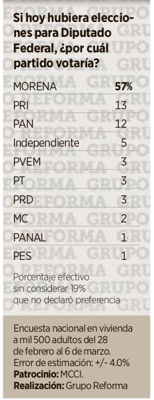 La encuesta añade que si hoy fueran las elecciones a diputados federales, el Movimiento de Regeneración Nacional (Morena) obtendría el 57 por ciento de los sufragios.