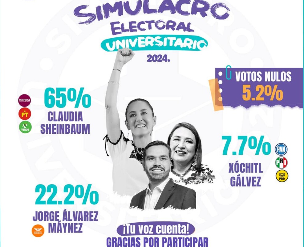 Se trató de un ejercicio inédito donde participaron más de 300 mil universitarios de las instituciones universitarias más importantes del país, en donde la candidata de la coalición “Sigamos Haciendo Historia”, Claudia Sheinbaum, encabezó con un 65%, las preferencias electorales en el Simulacro Electoral Universitario 2024 que se llevó a cabo este 7 de mayo.