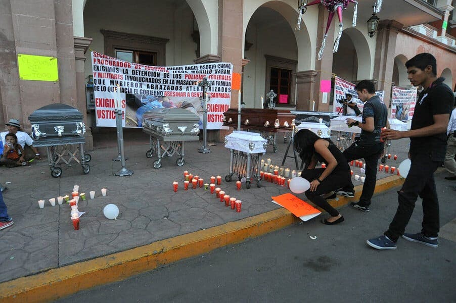 Cuatro de las personas presentaron “27,7,7 y 8 lesiones por proyectil de arma de fuego”, afirma el reporte. Precisa que “los occisos no poseían armas de fuego y tampoco se encontró algún arma cerca de sus cuerpos”. Por el contrario, “se observaron palos y no armas de fuego cortas o largas, lo que permite considerar que los occisos se encontraban desarmados”.