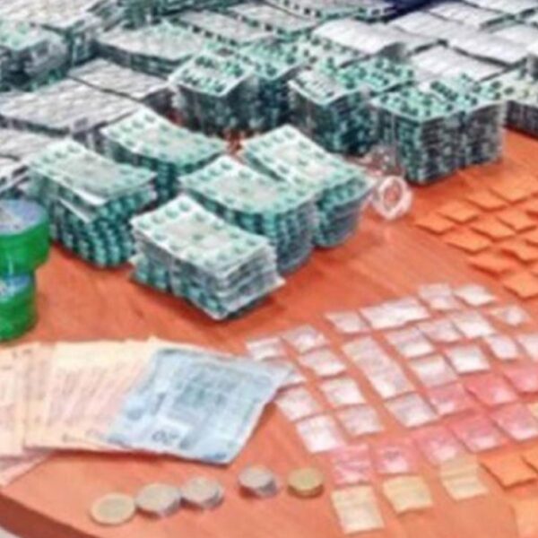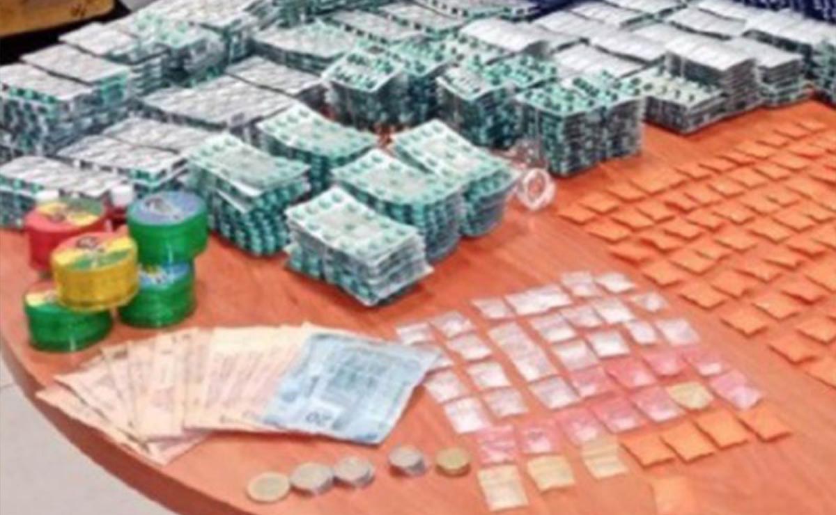 Según información en el inmueble, el personal de la Fiscalía aseguró 238 envoltorios con contenido de características similares al cristal, 1,188 tablillas con un total de 14,995 pastillas de medicamento y dinero en efectivo.
