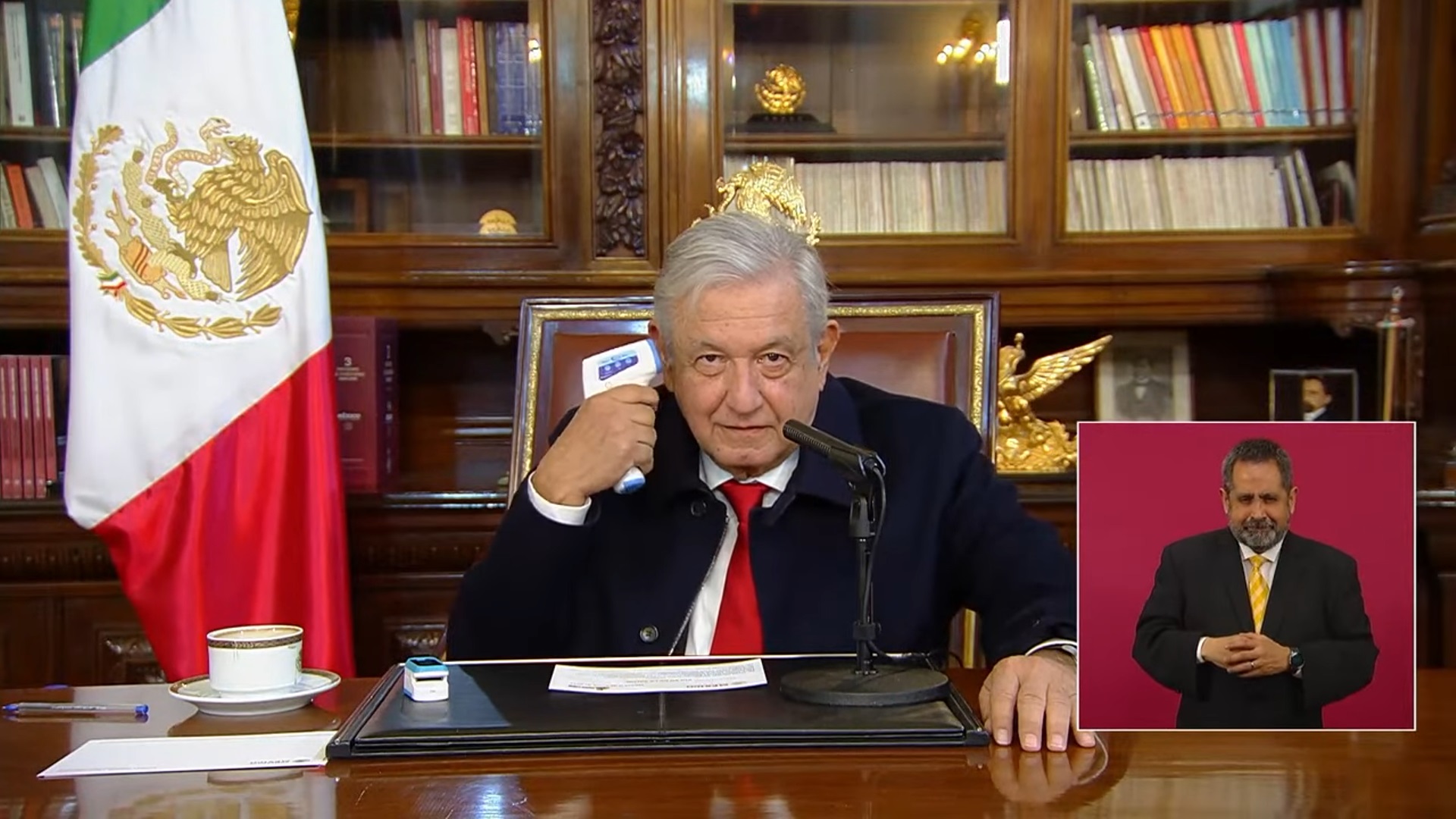 “Me voy a medir la temperatura: 36.1; así está, no he tenido temperatura; oxigenación, 96” -dijo el mandatario, mientras accionaba, sucesivamente, el termómetro electrónico y el oxímetro.