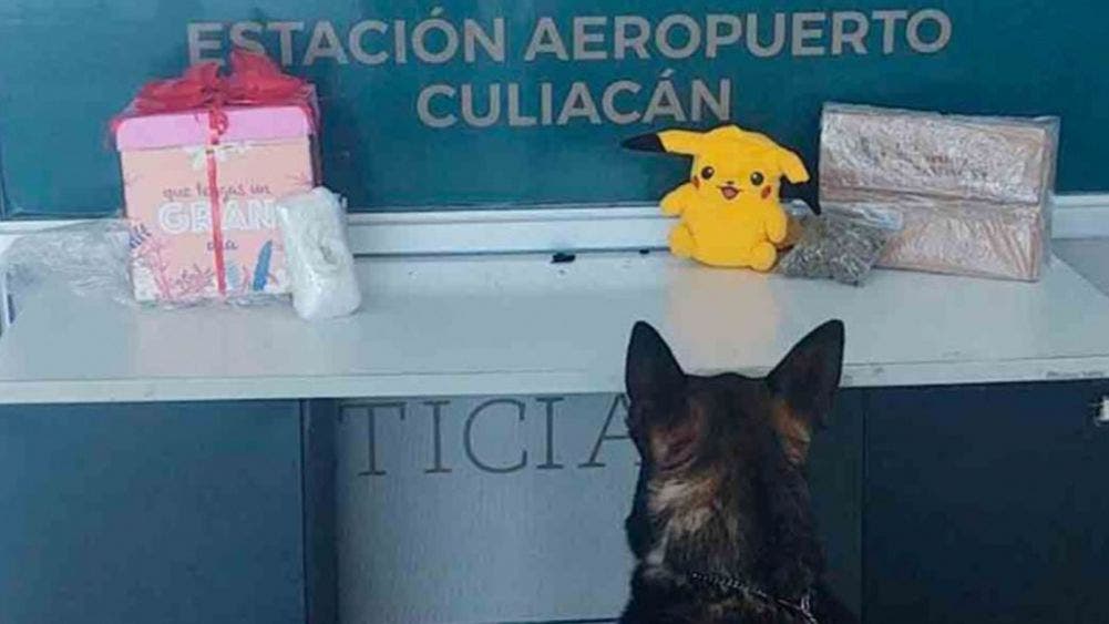 Aseguran droga oculta en un muñeco de peluche en aeropuerto. Elementos de la Guardia Nacional, con apoyo de binomios, inspeccionaron el área de carga de empresas de paquetería, ubicadas en el Aeropuerto Internacional de Culiacán, Sinaloa; por lo que caninos localizaron dos envíos que trasladaban un muñeco de peluche de Pikachu con mariguana, y una prenda de vestir que ocultaba crystal.