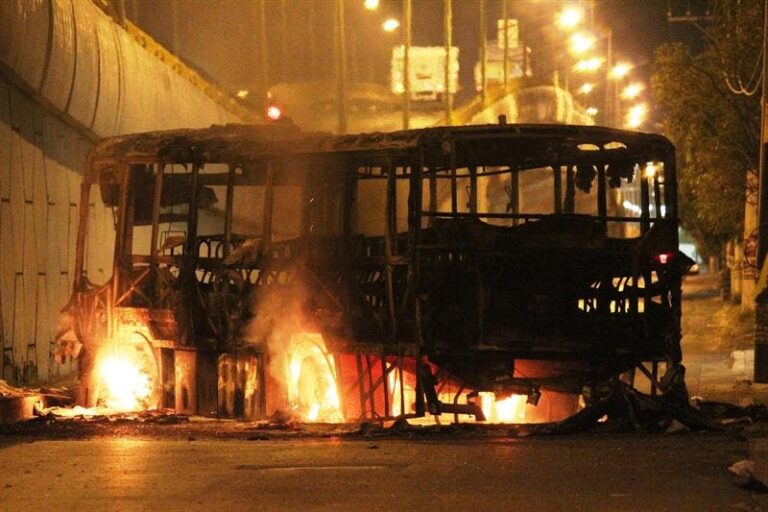 Barricadas con vehículos incendiados colocados para impedir los operativos de las fuerzas armadas, en las inmediaciones de la población de Santa Rosa de Lima.