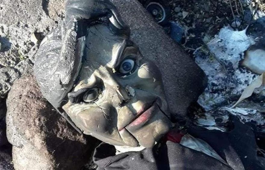 Para hacer más “aterrador” el hallazgo, el muñeco posee garras en lugar de manos. Tal como se aprecia en las fotografías compartidas en la red. Aparentemente los mismos pobladores de la zona intentaron quemar al inquietante muñeco.