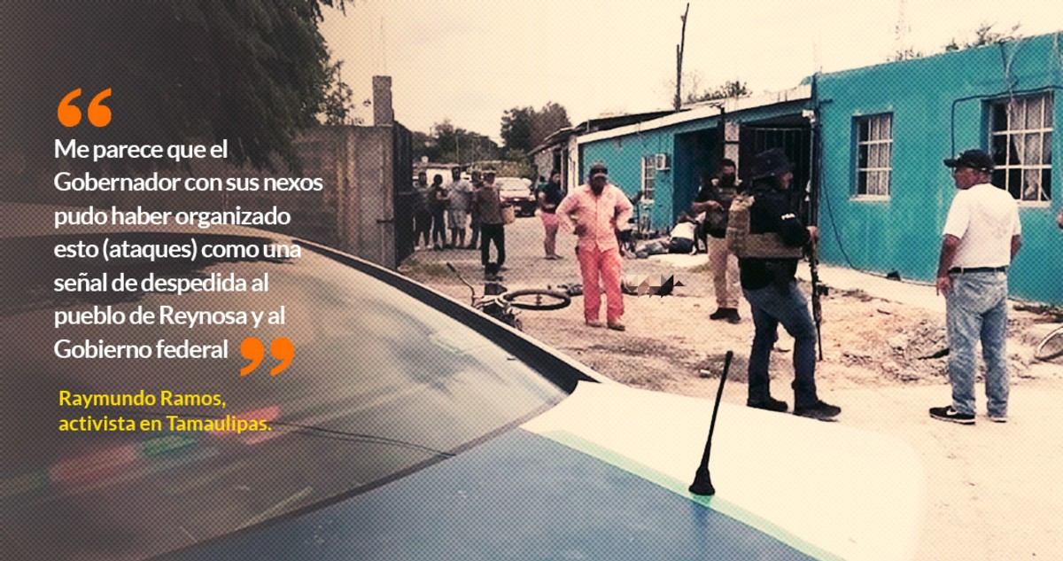 “Me parece que el gobernador con sus nexos pudo haber organizado esto (ataques) como una señal de despedida al pueblo de Reynosa y al Gobierno federal; y como un acto de provocación para las nuevas autoridades estatales […] siento que el gobernador tiene manchadas las manos con sangre de gente inocente”, expresó el activista en entrevista con el sitio web SinEmbargo.