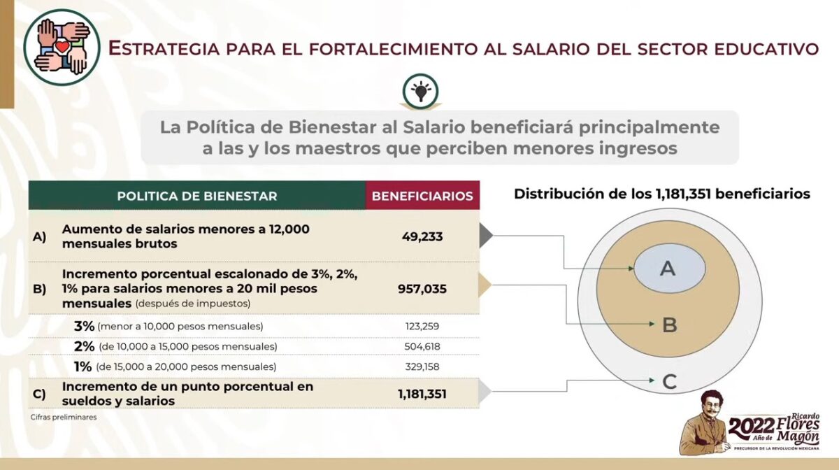 Informó que la Política de Bienestar al Salario de maestras y maestros pretende beneficiar a un millón 101 mil trabajadores de la educación; se dará prioridad a los de menos ingresos a fin de corregir injusticias e inequidades en las remuneraciones.
