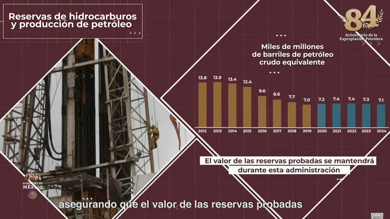 Como se puede observar en la gráfica, añadió, las reservas probadas disminuyeron en 52 por ciento entre 2007 y 2018, administraciones del presidente Calderón y de Peña Nieto. Durante esta administración se ha logrado detener y revertir esta tendencia y año con año hemos restituido la reserva extraída y la hemos incrementado.