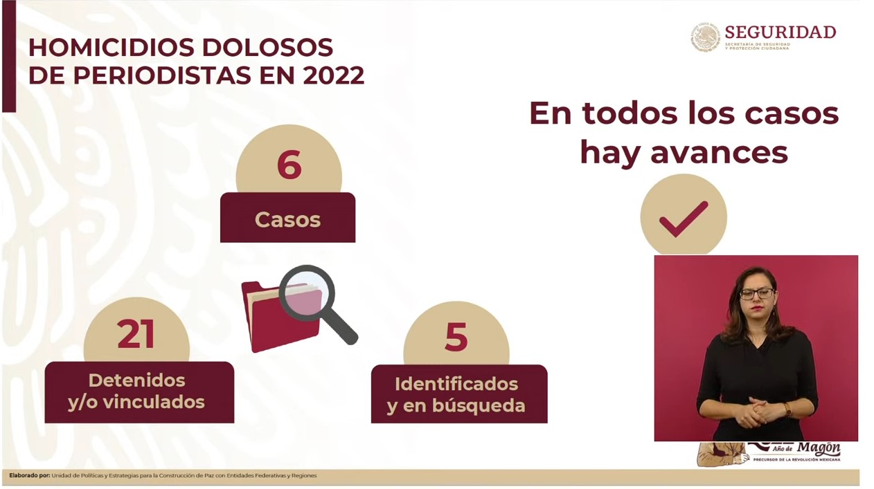 Al presentar los resultados de la estrategia de cero impunidad de parte del gobierno federal, la secretaria de Seguridad y Protección Ciudadana, Rosa Icela Rodríguez, puntualizó que en los caso de los seis homicidios de periodistas -contabilizados por la actual administración-, se ha detenido o vinculado a proceso a 21 personas responsables y resta encontrar a otros cinco probables participantes en esos crímenes.