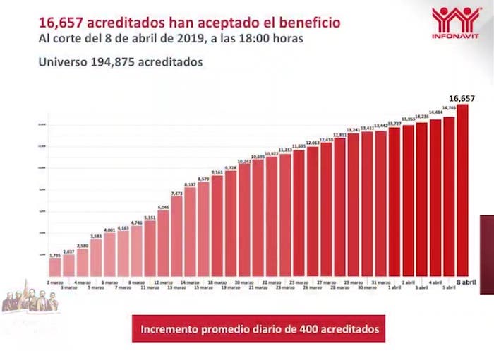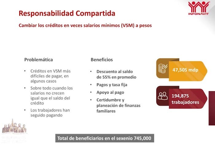 “El programa de responsabilidad compartida (…) es un programa que busca cambiar los créditos que venían indexados al salario mínimo, a pesos y ofrecer a los trabajadores un descuento a su saldo, que en promedio ronda el 55 por ciento y ofrecerles un esquema de pago y tasa fija”, dijo Martínez Velázquez.