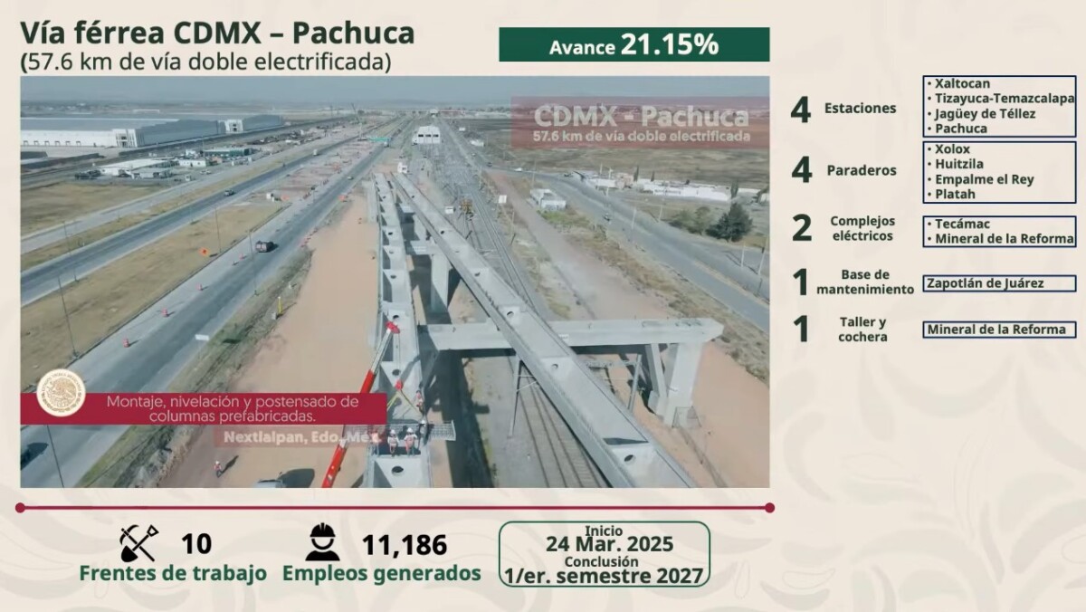 Durante la conferencia presidencial, Vallejo Suárez informó además que el proyecto del tren de pasajeros Ciudad de México a Pachuca, que tiene una longitud total de 57.6 kilómetros, se tiene un avance de 21 por ciento de vía doble electrificada.
