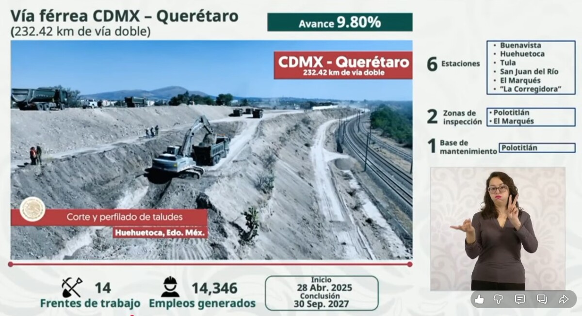 Mencionó que en este caso el avance físico es del diez por ciento, subrayando que se construirán 28 kilómetros de viaducto elevado en algunas zonas urbanas. Puntualizó que en este proyecto se pretende la construcción de seis estaciones.