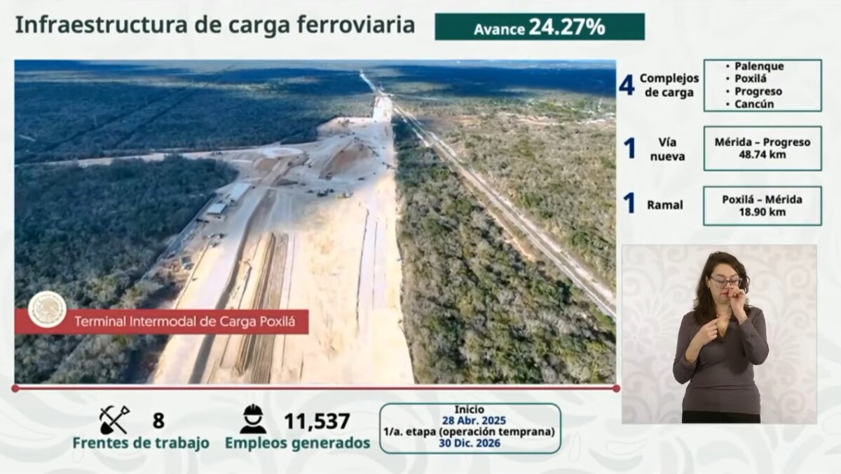 Respecto a la construcción de la primera fase de la infraestructura de carga del Tren Maya, se tiene un avance del 25 por ciento, se han generado 11 mil 537 empleos directos y se estima finalizar los trabajos de la primera etapa en diciembre de este año, concluyendo los trabajos en su totalidad para septiembre 2027.