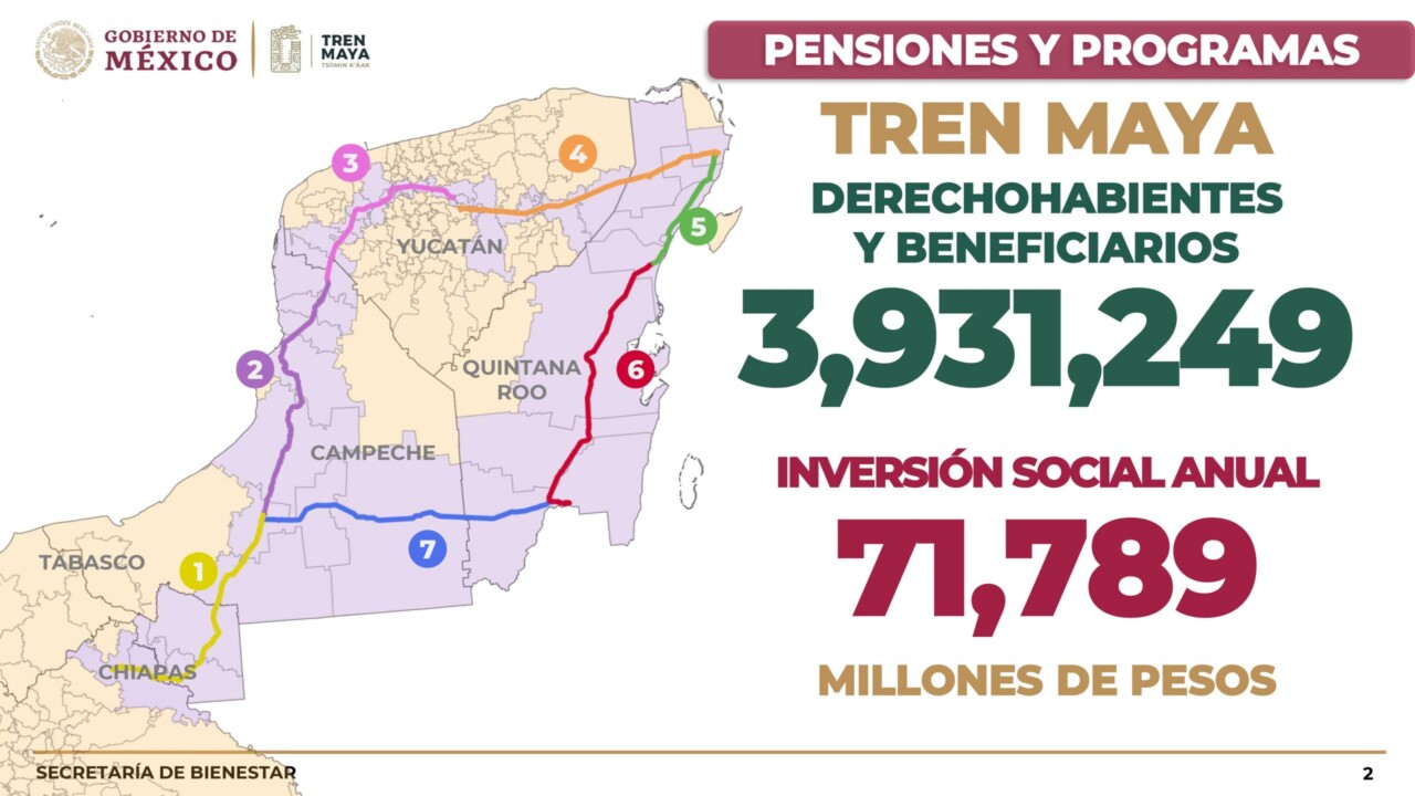 En el informe integral del Tren Maya, la secretaria de Bienestar, Ariadna Montiel Reyes, dio a conocer que 3 millones 931 mil 249 personas acceden a Programas para el Bienestar, como pensiones, becas y otros apoyos federales dedicados a garantizar oportunidades a la población habitante de comunidades de la ruta de este proyecto estratégico.