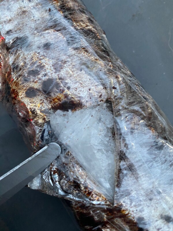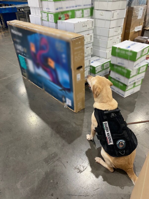 Para corroborar el hallazgo, se llevó a cabo un segundo rastreo con otro binomio canino, obteniendo una indicación similar; por tal motivo, los integrantes de la institución inspeccionaron la caja que contenía una televisión de 65 pulgadas, la cual ocultaba en su interior ocho paquetes envueltos en papel aluminio con una sustancia blanca y cristalina con las características de la droga sintética cristal.