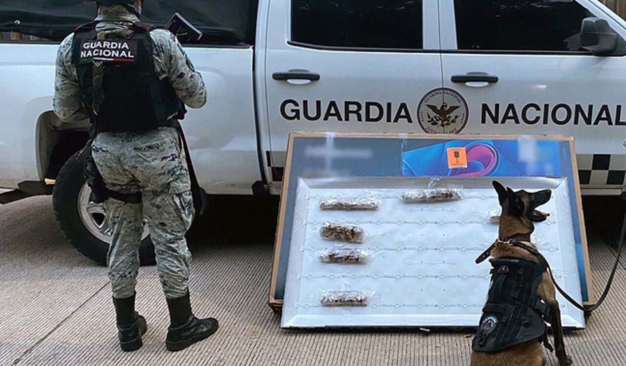 En Sinaloa, integrantes de la Guardia Nacional (GN) aseguraron droga sintética cristal oculta dentro de una pantalla inteligente, la cual fue detectada por binomios caninos.