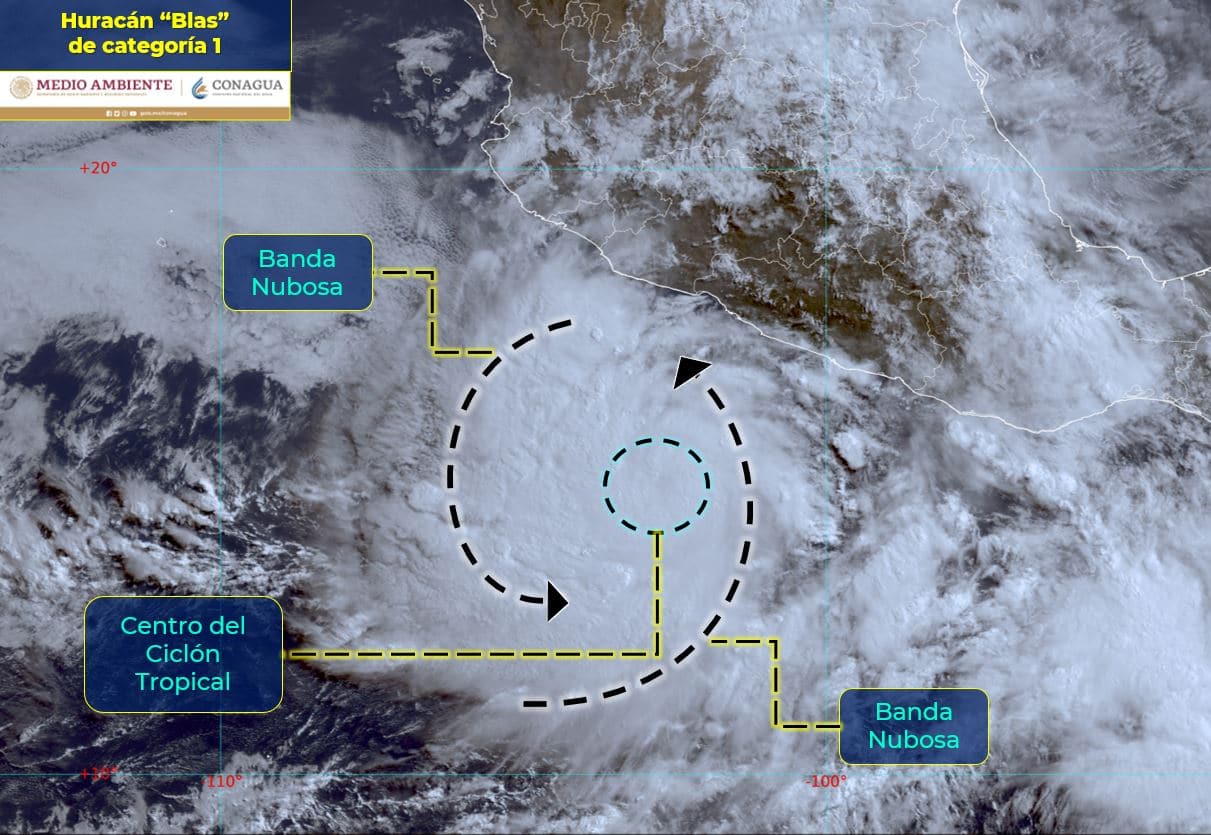 A las 10 horas de este miércoles, tiempo del centro de México, “Blas” se intensificó a huracán categoría 1 en la escala Saffir-Simpson.