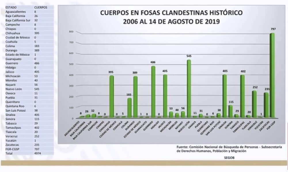 También informó que en México existe un total de tres mil 24 fosas clandestinas, donde se han hallado 4 mil 974 cuerpos.