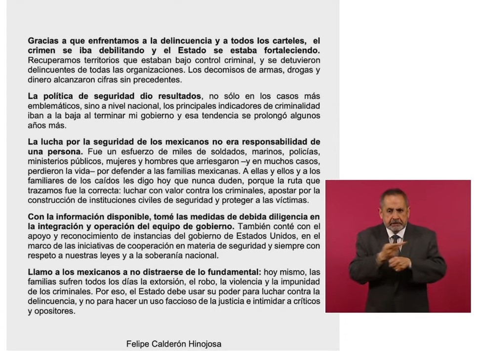 Calderón afirmó que como titular del Ejecutivo federal “luché con toda determinación en contra de la delincuencia, con la ley en la mano, sin dar tregua ni hacer distinción entre grupos. Jamás negocié ni pacté con criminales. Jamás usé la investidura presidencial para abogar por sus intereses”.