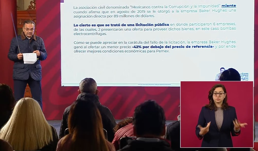 “La asociación civil Mexicanos contra la Corrupción y la Impunidad miente cuando afirma que en agosto de 2019 se le otorgó a la empresa Baker una asignación directa por 89 millones de dólares. Lo cierto es que se trató de una licitación pública en donde participaron seis empresas de las cuales dos presentaron una oferta para proveer dichos bienes, en este caso, de bombas electro centrífugas”.