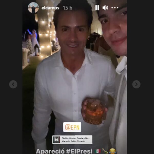 En un video en las historias de Instagram, Camus García Caballero, hermano de la novia mostró al exmantadario, con quien compartió la mesa de honor junto a la pareja de Peña Nieto, Ruiz Eichelmann y acompañados del exministro de las Tecnologías de la Información y las Comunicaciones de Colombia, David Luna, esposo de Laura, también hermana de la novia.
