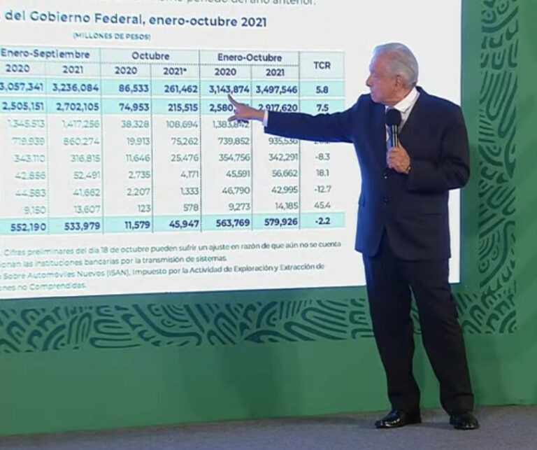 Le informaron ayer que de enero a octubre de este año se han recaudado tres billones 497 mil millones de pesos, cifra que significa más de 350 mil millones, comparado con el mismo periodo de 2020.