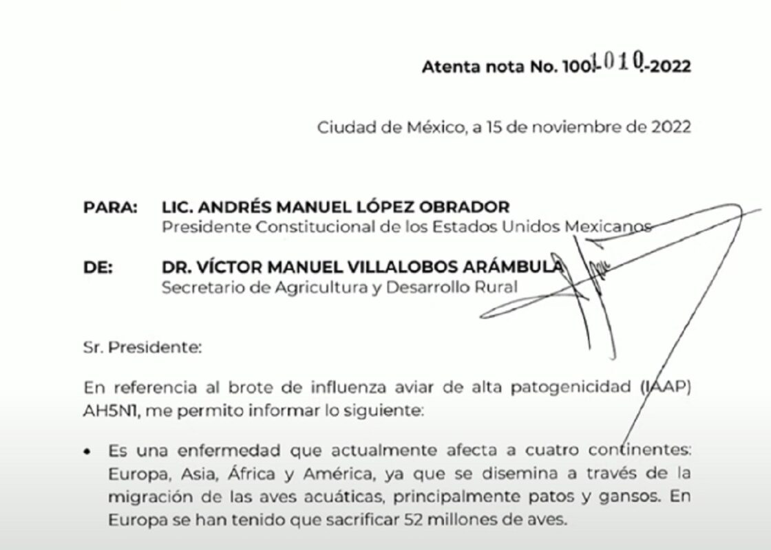 En la pantalla dispuesta en el Salón Tesorería de Palacio Nacional presentó un informe que le envió el secretario de Agricultura, fechado el 15 de noviembre, en referencia al brote de influenza aviar.