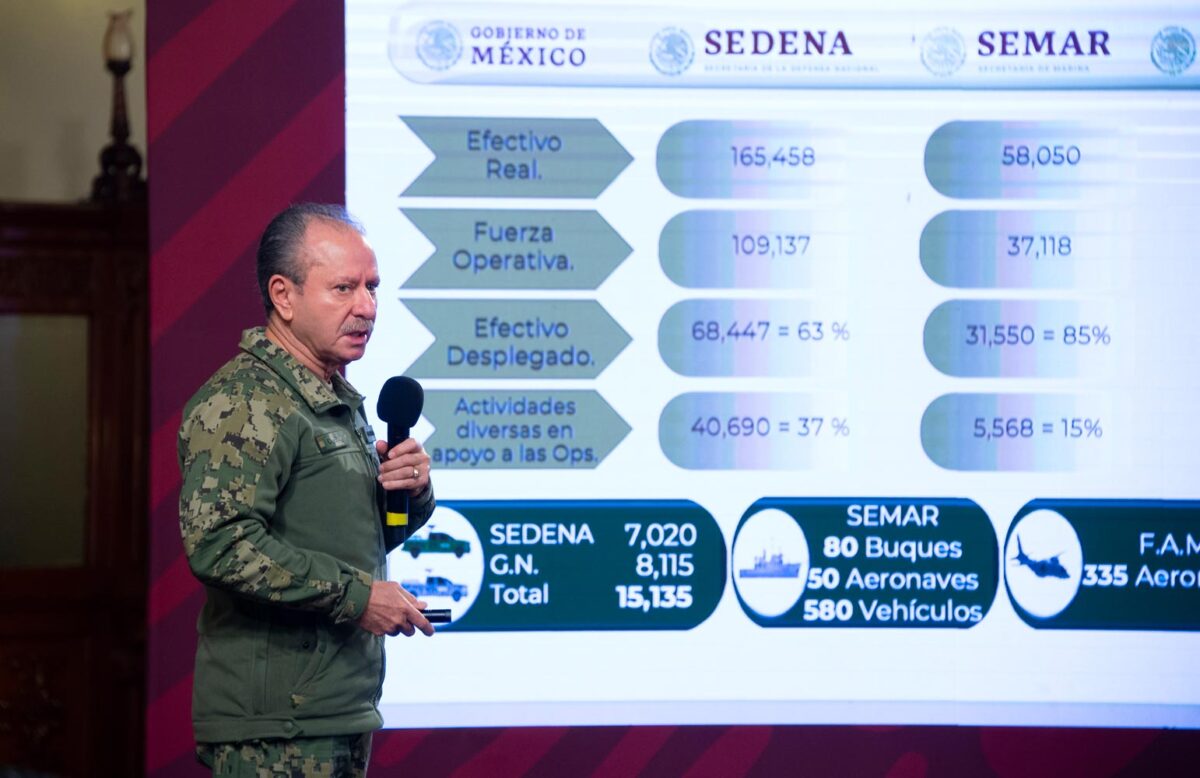 A la fecha, la Secretaría de Marina cuenta con 22 mil 822 efectivos desplegados en siete misiones que contemplan el mantenimiento del Estado de Derecho, la protección marítima y portuaria, la coordinación estratégica de seguridad en el Aeropuerto Internacional de la Ciudad de México, así como las operaciones del Ferrocarril Interoceánico del Istmo de Tehuantepec.