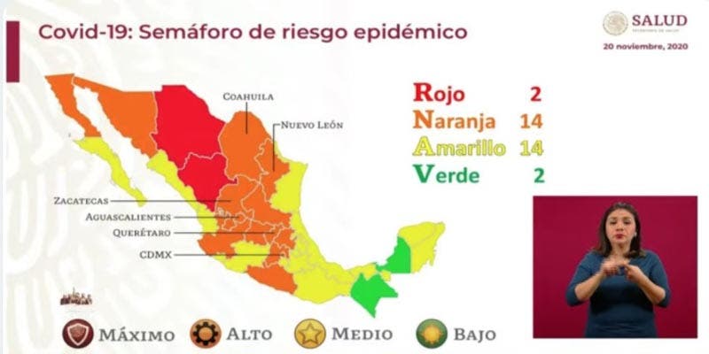 No obstante, la secretaría señaló que Aguascalientes, CDMX, Coahuila, Nuevo León, Querétaro y Zacatecas, presentan altos riesgos, aunque aún continúan en semáforo naranja.
