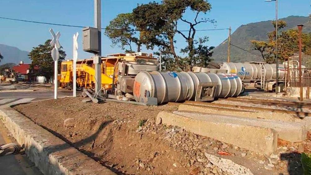 Choca pipa cargada con sosa cáustica contra tren. Un tractocamión de doble remolque, el cual transportaba químicos, chocó con un tren, al tratar de cruzar las vías ferroviarias en Orizaba, Veracruz.
