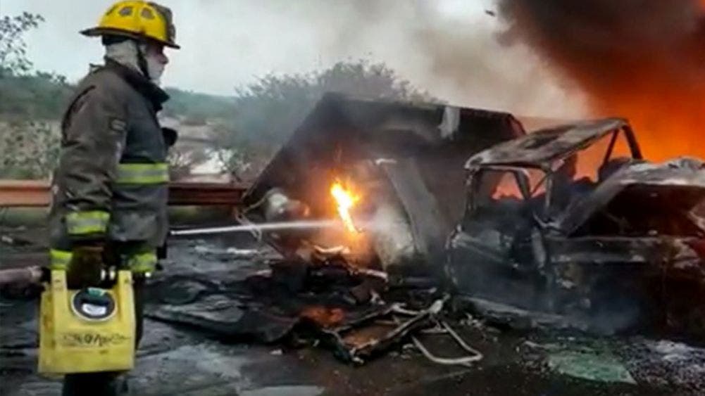 Luego del choque de los vehículos, terminaron incendiados. La camioneta carburaba con gas LP, por lo que tenía dos tanques de 200 litros los cuáles afortunadamente no explotaron; mientras el tráiler utilizaba diésel, componentes que dificultaron las labores de enfriamiento.