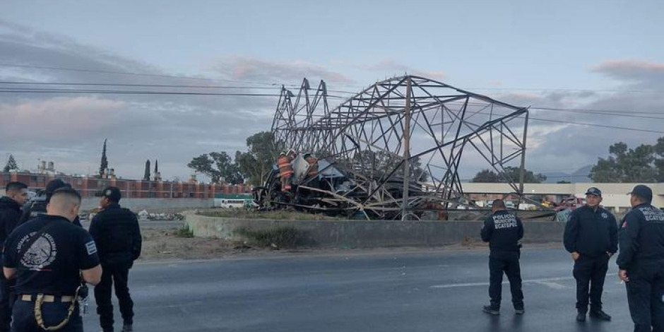 Al evitar chocar contra el auto de una mujer que invadió el carril, el trailero volcó tras derribar una torre eléctrica de gran altura en Ecatepec.