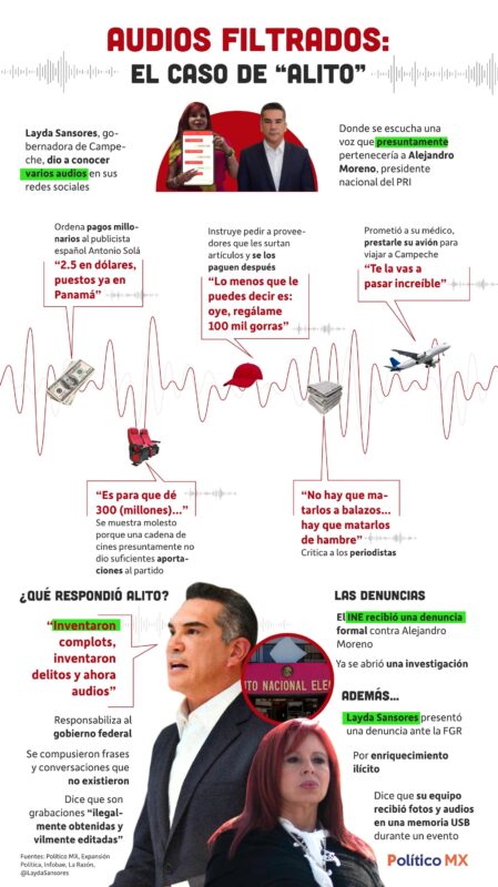 Los primeros audios filtrados alzaron cuestionamientos sobre las acciones de “Alito”, pues en ellos se le escucha hablar de extorsionar al dueño de Cinépolis y a contratistas en Campeche, ordenar pagos de millones de dólares al publicista español Antonio Solá, y presuntamente hacer un negocio con medicamentos.