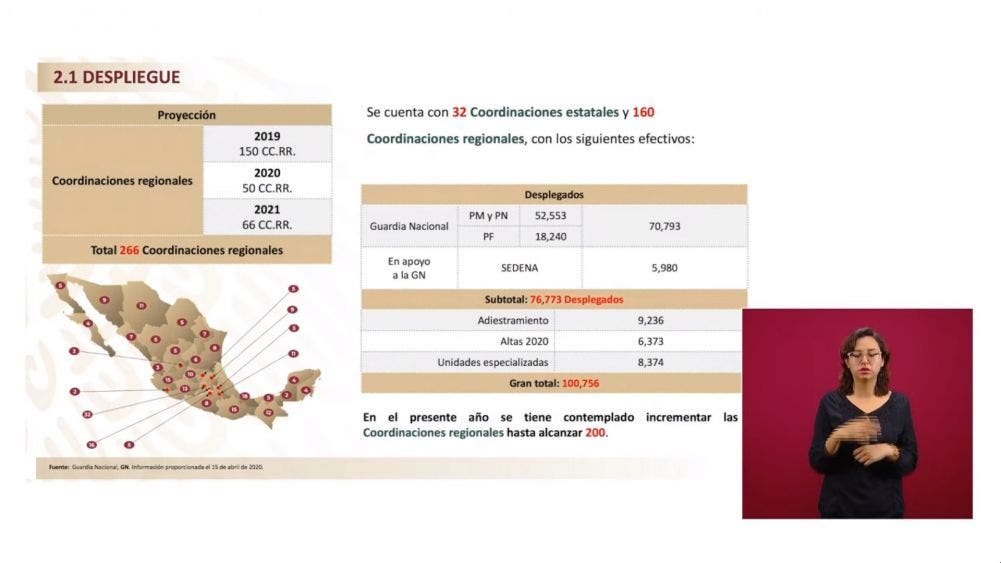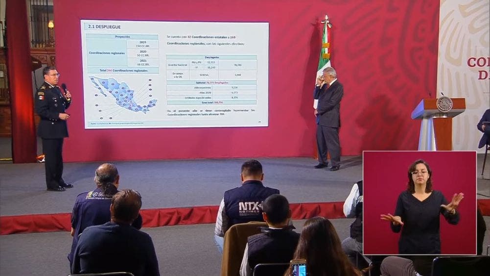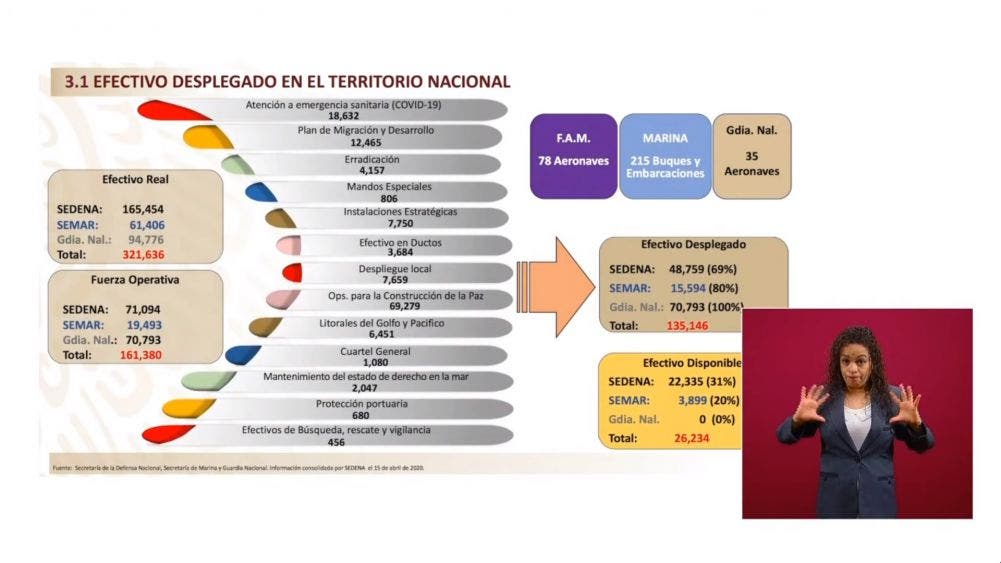 “El efectivo que está desplegado en todo el territorio nacional por parte de las fuerzas del Estado es de 165 mil 454 elementos del Ejército; 61 mil 406 de la Marina, 94 mil 776 de la Guardia Nacional. En total 321 mil 636 elementos”, dijo.