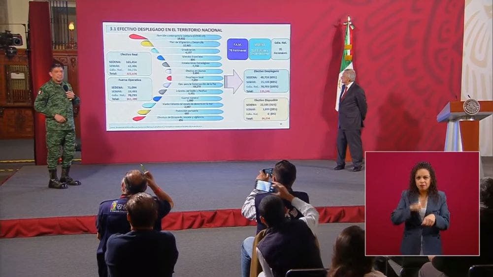 “El efectivo que está desplegado en todo el territorio nacional por parte de las fuerzas del Estado es de 165 mil 454 elementos del Ejército; 61 mil 406 de la Marina, 94 mil 776 de la Guardia Nacional. En total 321 mil 636 elementos”, dijo.
