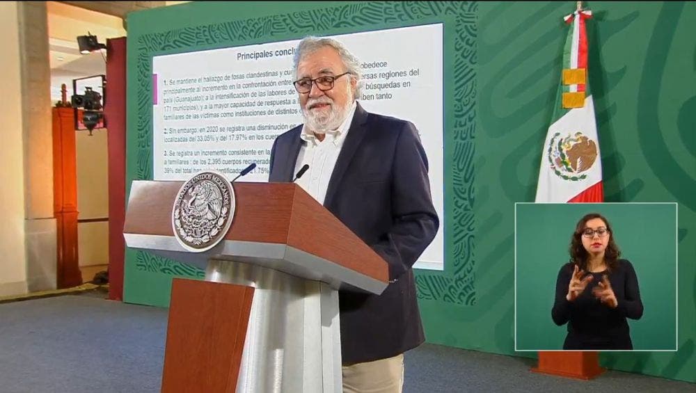 “Sin embargo, en 2020 se registra una disminución en el número de fosas clandestinas localizadas del 33.05 por ciento, y del 17.97 por ciento en los cuerpos recuperados en estos, respecto al año 2019”, se indica en el informe expuesto por el subsecretario de Derechos Humanos, Población y Migración de la SG, Alejandro Encinas.