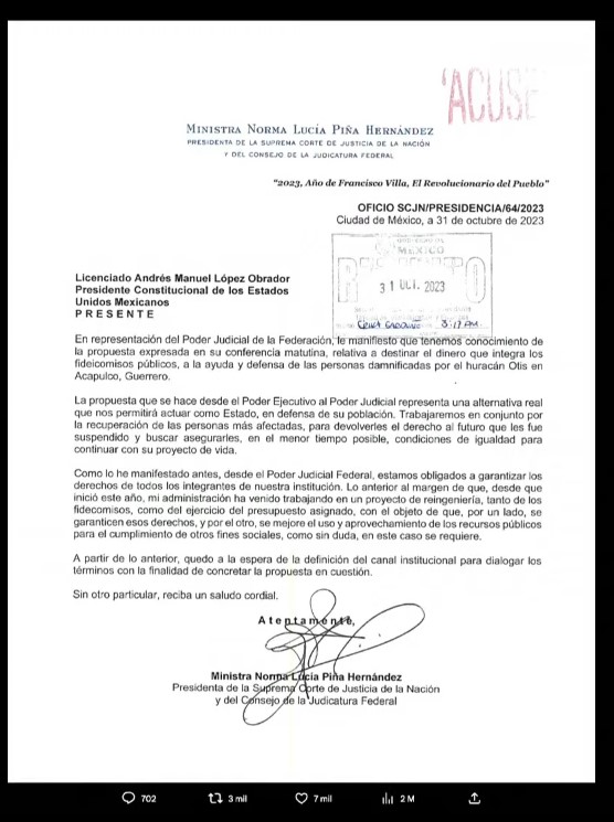 Durante la conferencia matutina leyó el oficio que le envió la ministra presidenta de la Suprema Corte de Justicia, Norma Piña, en la que refiere que la propuesta de destinar los recursos de 13 fideicomisos del Poder Judicial a las personas damnificadas “representa una alternativa real que nos permitirá actuar como Estado, en defensa de su población”.