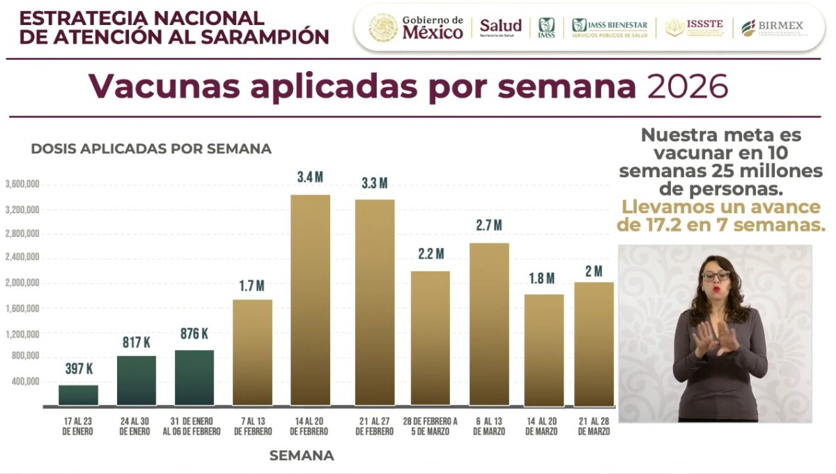 Indicó que la campaña inició en la semana del 7 de febrero, con una aplicación inicial de 1.7 millones de vacunas, y ha mantenido un ritmo semanal que va de 1.7 a 3.4 millones de dosis, lo que ha permitido avanzar conforme a lo previsto.