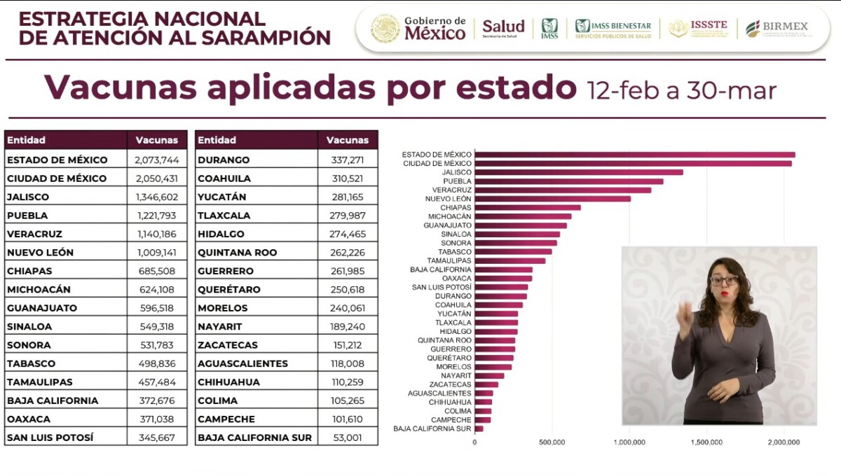 En el desglose de aplicación de vacunas de la SSA por estados, informó que el Estado de México encabeza la aplicación con 2 millones 73 mil dosis, seguido de la Ciudad de México, también con una cifra cercana a los 2 millones. Por su parte, Jalisco, que había sido uno de los focos principales de contagio, acumula 1.3 millones de vacunas aplicadas, mientras que Puebla supera los 1.2 millones.