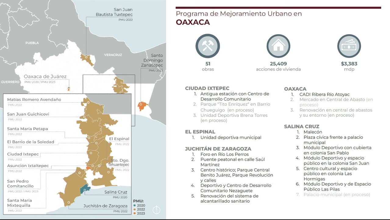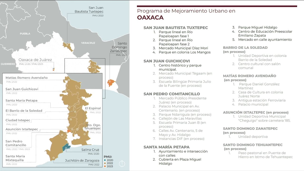 En Oaxaca, las obras benefician a los municipios de Ciudad Ixtepec, El Espinal, Juchitán de Zaragoza, Oaxaca de Juárez, Salina Cruz, San Juan Bautista Tuxtepec, San Juan Guichicovi, San Pedro Comitancillo, El Barrio de la Soledad, Matías Romero Avendaño, Asunción Ixtaltepec, Santo Domingo Zanatepec y Santo Domingo Tehuantepec.