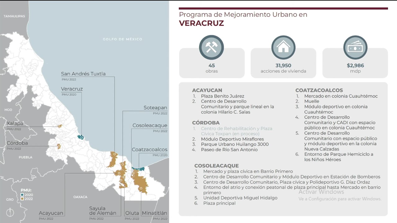 En Veracruz, a los municipios de Acayucan, Córdoba, Cosoleacaque, Coatzacoalcos, Minatitlán, Oluta, Sayula de Alemán, San Andrés Tuxtla, Soteapan y Xalapa, apuntó el mandatario.