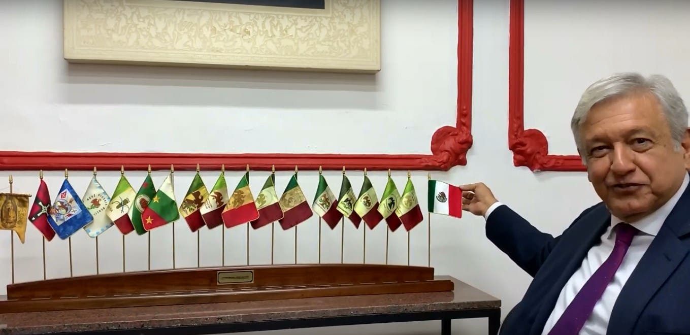 El Presidente electo, Andrés Manuel López Obrador, muestra las banderas históricas de México.
