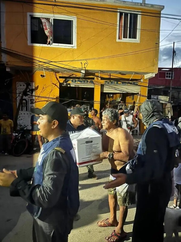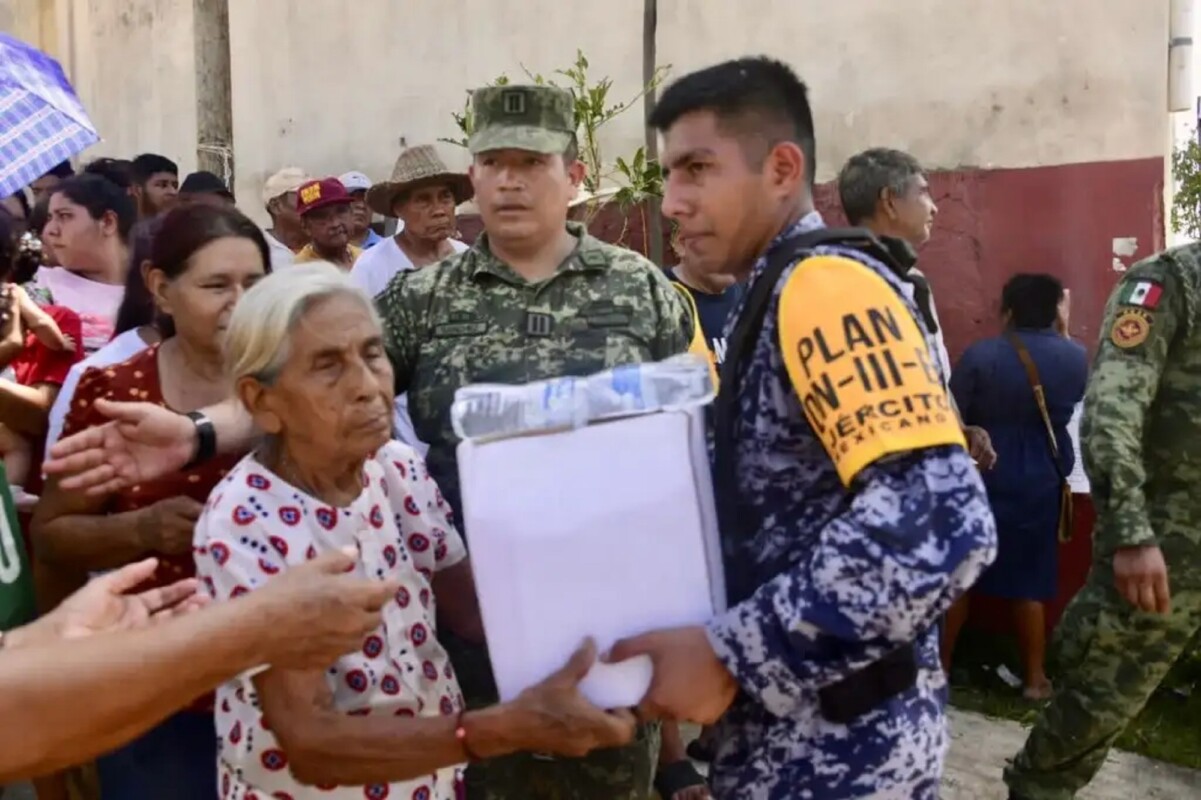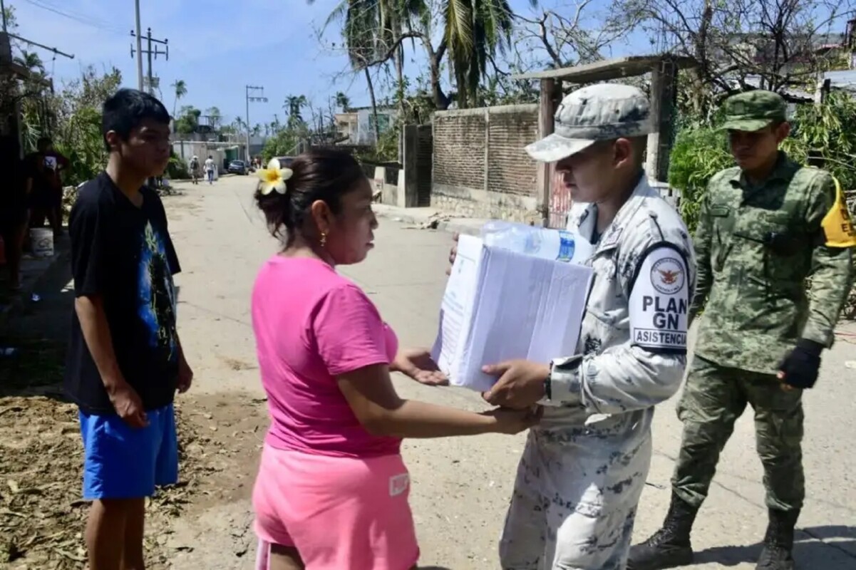 La Secretaría de Seguridad y Protección Ciudadana (SSPC) indicó que el personal de la Secretaría de la Defensa Nacional (Sedena), de la Secretaría de Marina (Semar) y de la Guardia Nacional (GN), desplegado en Acapulco, distribuyen despensas entre la población afectada por el paso del huracán Otis.