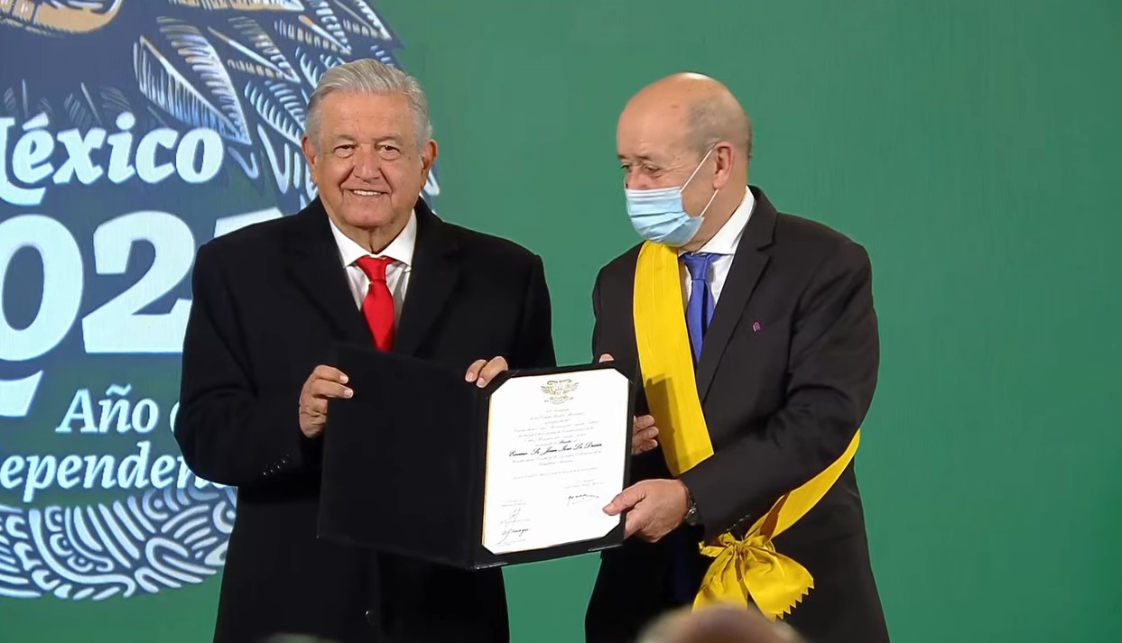 “Me da gusto que hoy el gobierno de México haga un reconocimiento especial al canciller de Francia, ministro de asuntos exteriores de Francia por su desempeño en favor de la política exterior, en especial por su trato amistoso, fraterno, con el gobierno de México y con nuestro pueblo. Por eso vamos a imponer la condecoración del Águila Azteca”, dijo el presidente Andrés Manuel López Obrador.