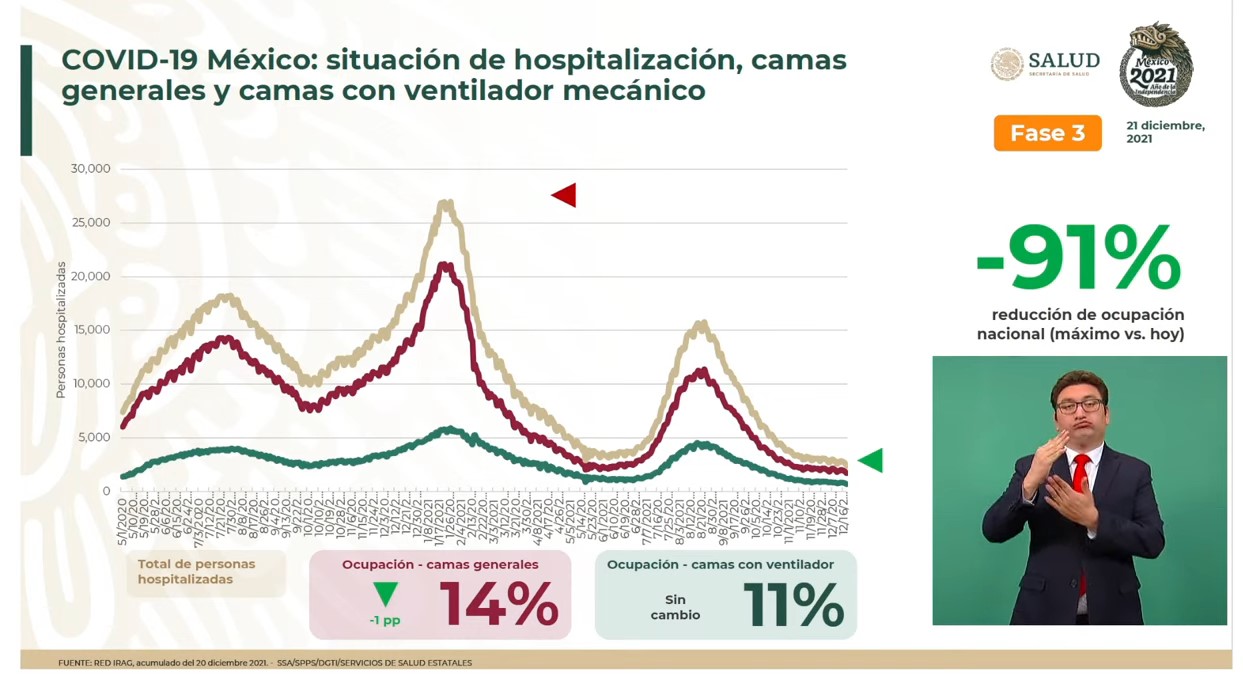 Agregó que la ocupación hospitalaria también se mantiene a la baja, pues se tiene una ocupación de menos del 10 por ciento de las camas destinadas a pacientes Covid. Destacó que en cualquier momento es posible reactivar la reconversión hospitalaria, si se incrementa la demanda de camas.