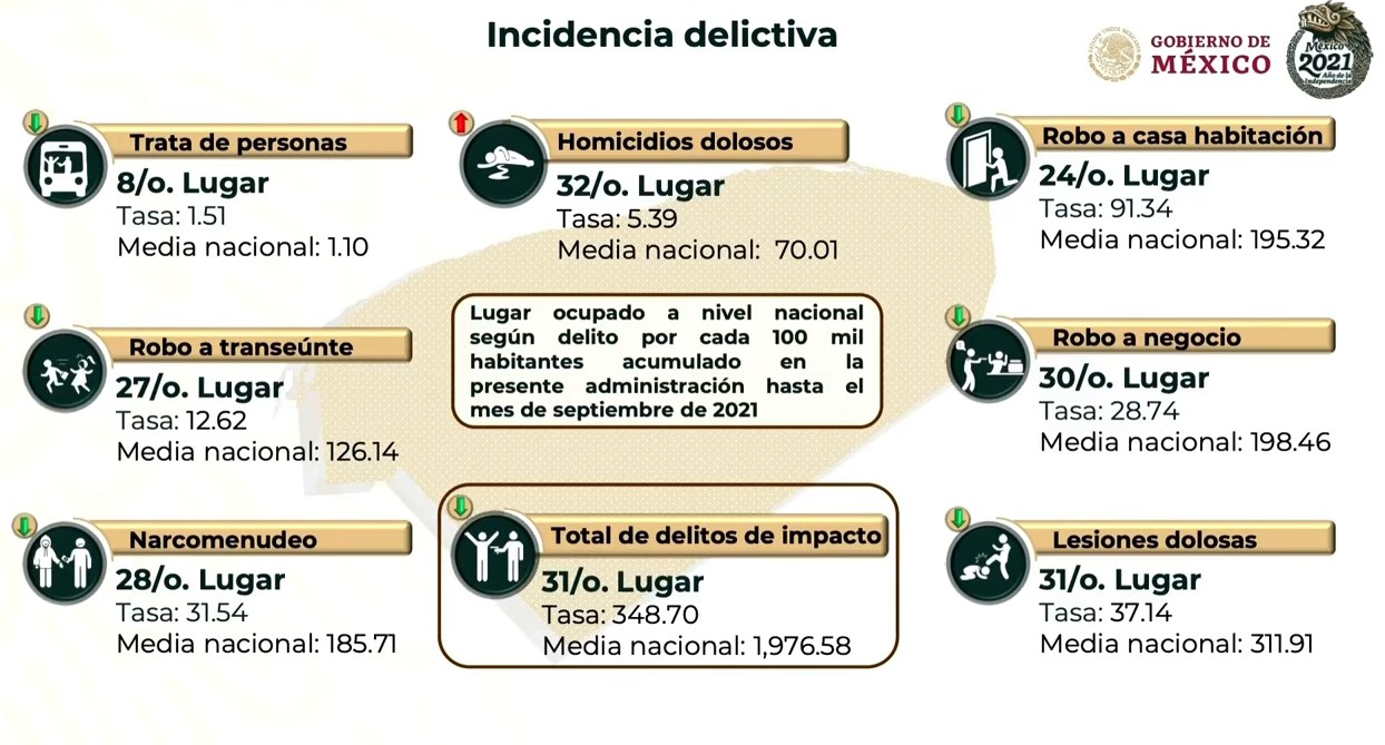“Vemos los delitos, están todos con incidencia a la baja. En cuanto a delitos de alto impacto como trata, robo, narcomenudeo, robo a casa o lesiones dolosas, todos tienen una tendencia a la baja. El homicidio doloso tiene un incremento”, explicó.